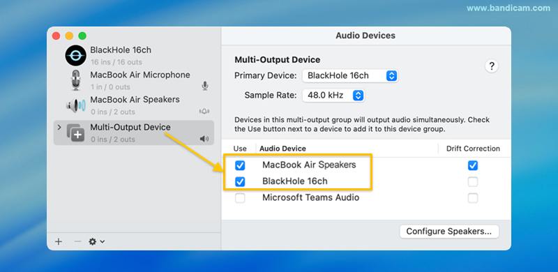 3. Select BlackHole and your main output device (e.g., MacBook Speakers).