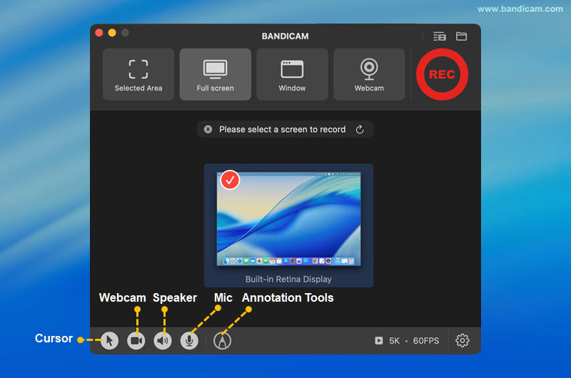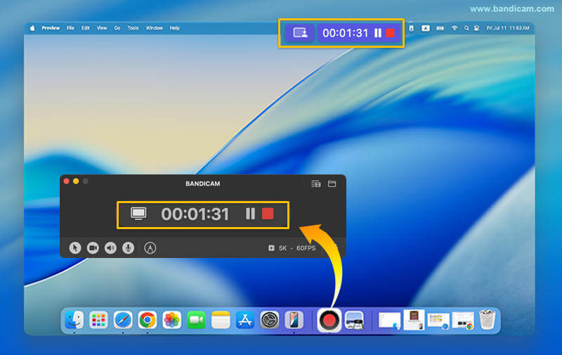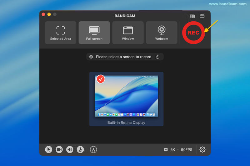 To record your Mac screen in 5K (5120 × 2880), both your display and screen recording software must support that resolution. Some recorders may automatically downscale to 4K, so make sure your software—such as Bandicam—explicitly supports 5K screen recording on macOS.